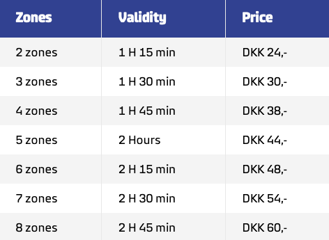 Le prix du ticket dépend du nombre de zones de traversées pour votre trajet, allant de 24 DKK (3,22€) pour 2 zones à 60 DKK (8€) pour 8 zones.